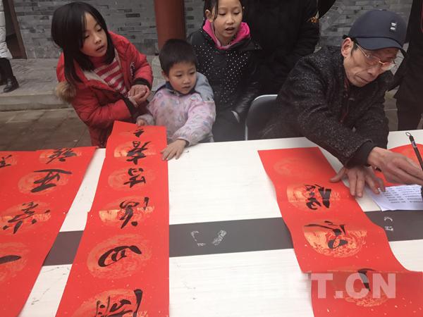 1月26日,2018年“新時代、新夢想”全國網(wǎng)絡(luò)媒體新春走基層活動(四川站)媒體團走進廣安市前鋒區(qū)代市鎮(zhèn)會龍村。記者們走過一排排獨具川東民居特色的房屋,看到一群中老年人正在寬敞的空地上跳著廣場舞,不遠(yuǎn)處的村民活動站內(nèi),幾位六七十歲的老大爺正聚在一起拉著二胡唱著歌,不遠(yuǎn)處支起一張長長的桌子,一位老人正在為村民們寫著春聯(lián),“現(xiàn)在眼看著日子好起來了,大家都搬進了新房??爝^年了,我在這給大伙免費寫春聯(lián),添添喜氣?,F(xiàn)在我也有徒弟了,村上好幾個人平常有空了都來跟我學(xué)學(xué)寫字啥的?!狈接烂骼先诉厡懽诌厡τ浾哒f道。眼前這番景象,很難讓人將會龍村和貧困村聯(lián)系在一起。