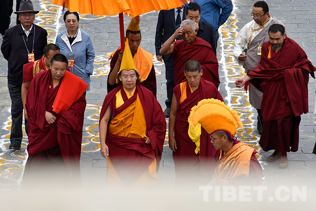 十一世班禪頭戴金色佛冠,由手持香炷的僧人引領(lǐng),緩緩步入杜康大殿。在僧人們渾厚的誦經(jīng)聲中,十一世班禪登上法座,領(lǐng)誦經(jīng)文。寺廟僧人向十一世班禪敬獻曼扎等,十一世班禪微笑接過后,為僧人摸頂賜福,并發(fā)放布施、供齋茶齋飯。隨后,十一世班禪朝拜珍珠唐卡殿。