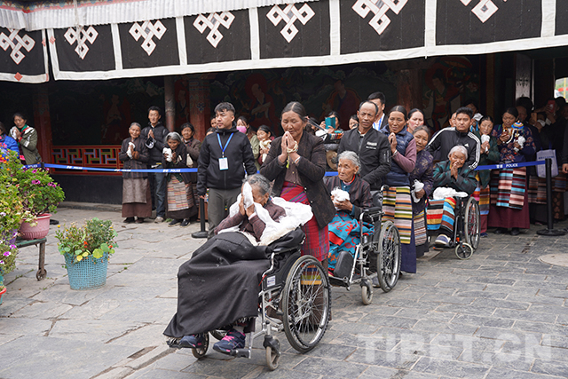 禮佛活動結(jié)束后,十一世班禪登上設(shè)在杜康殿門前的法座,為信教群眾摸頂賜福。此時,寺院外的廣場上,信教群眾已從四面八方趕來。隊伍里,有拄著拐杖的老人,有坐著輪椅來的老人,還有被年輕人背來的老人。
