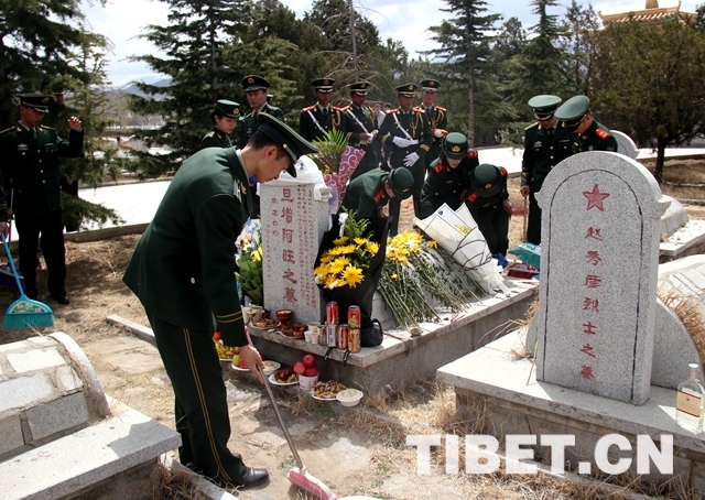 圖為西藏公安邊防總隊(duì)官兵祭掃烈士墓。