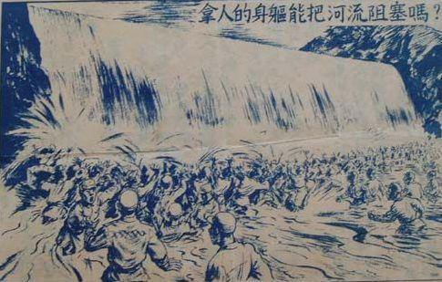 圖中畫的是一群軍人正在河流中,水流傾瀉在他們身上。圖上還有一句話:拿人的身軀能把河流阻塞嗎?