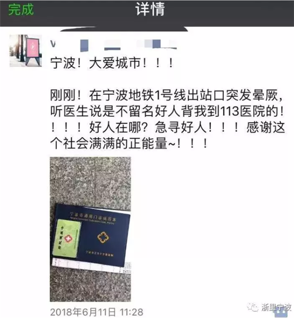 6月11日,許女士在寧波出差時突然暈倒在地鐵站,一名素不相識的年輕小伙子抱起她出地鐵站后又背她到附近的寧波解放軍第113醫(yī)院。在得知許女士暈倒是因為貧血已無大礙后,小伙沒有留下任何信息離開了。