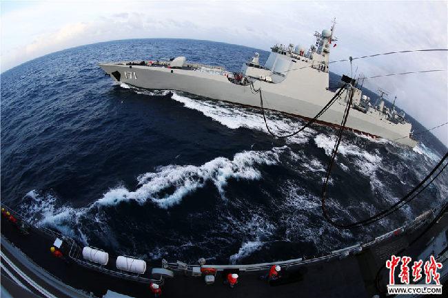 2017年2月6日,??谂瀰⒓舆h海訓練,圖為??谂炦M行橫向補給。時明華攝