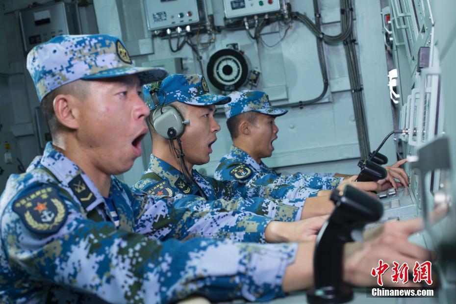 記者近日登上??谂灒嚯x探訪這艘被譽為“中華神盾”的海軍艦艇。圖為海口艦進行防空反導演練期間,官兵操縱副炮打擊來襲目標。(資料圖片)中新社記者 王棟 攝