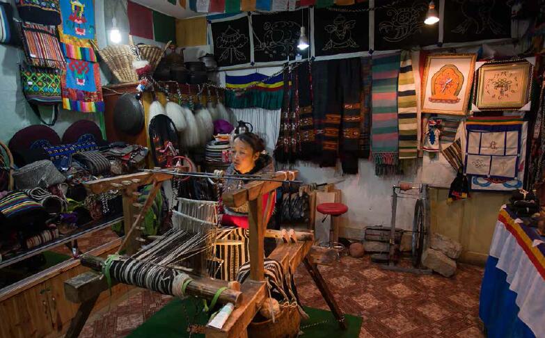 店內(nèi)的款式多樣、設(shè)計(jì)新穎、做工精細(xì)的背包、挎包、圍巾、毛毯等,簡(jiǎn)直是拉薩民間手工編織工藝品的大集合,珠杰的小女兒正在編織氆氌。