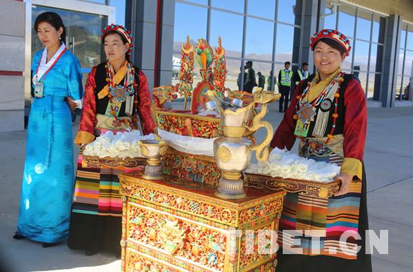 身著盛裝的禮儀人員向十一世班禪敬獻(xiàn)“切瑪”與青稞酒。攝影:王淑。