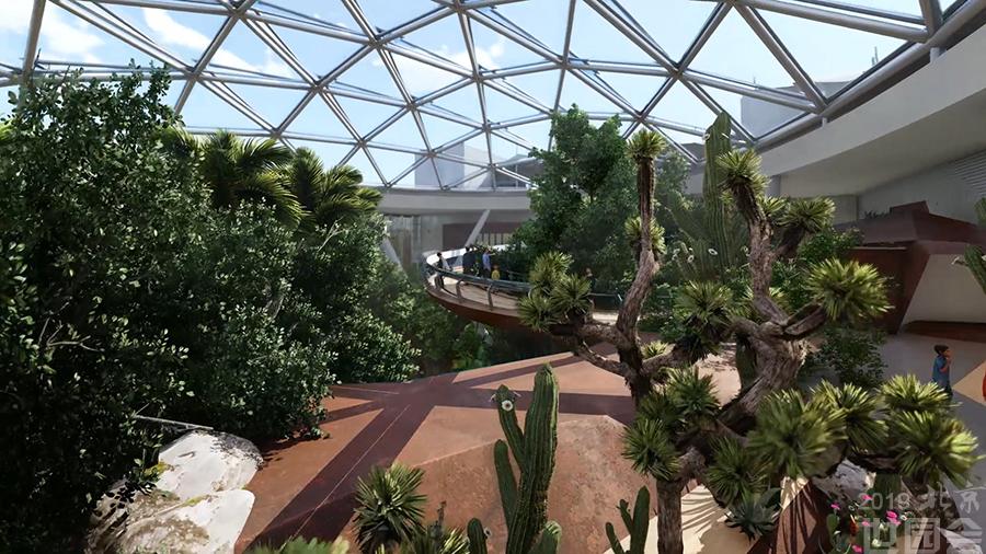植物館建筑分為三層,一層設(shè)有熱帶植物溫室,占地約3000平方米,匯聚600多種珍貴植物。通過(guò)紅樹林、熱帶雨林、蕨類、棕櫚、多漿植物、食蟲植物、苔蘚等展現(xiàn)植物王國(guó)的多樣性以及植物生存和適應(yīng)環(huán)境的智慧,設(shè)有5大展區(qū)12個(gè)景點(diǎn)。人工紅樹林,再現(xiàn)紅樹林適應(yīng)海潮漲落演化出的胎生、支柱根、泌鹽等特征,彰顯海岸衛(wèi)士的生態(tài)功能;熱帶雨林著力展現(xiàn)植物與植物、植物與動(dòng)物之間競(jìng)爭(zhēng)、協(xié)同的關(guān)系,如空中花園、獨(dú)木成林、老莖生花、滴水葉尖、巨葉現(xiàn)象、絞殺現(xiàn)象等;棕櫚科植物和蕨類植物展示其卓越的傳播繁衍智慧;多漿植物通過(guò)莖葉的變態(tài)進(jìn)化出適應(yīng)干旱環(huán)境的能力;食蟲植物靠食肉來(lái)攝取營(yíng)養(yǎng);植物王國(guó)的小矮人苔蘚如何找到適合自己的生存空間。展館通過(guò)一系列高科技創(chuàng)意手法,向參觀者充分展示“植物的智慧”,呼喚人類保護(hù)植物,關(guān)愛(ài)地球,關(guān)注人類的未來(lái)。
