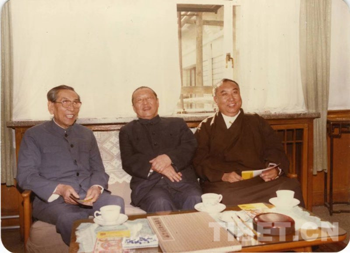 圖為1987年初,十世班禪大師與習仲勛、阿沛o阿旺晉美商議援助西藏發(fā)展基金會籌備事宜。