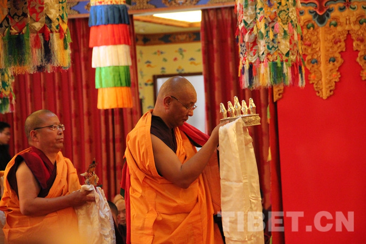 圖為土多申格副院長(zhǎng)帶領(lǐng)經(jīng)師代表和學(xué)員代表,虔誠(chéng)地向十一世班禪敬獻(xiàn)曼扎、佛像、佛塔、佛經(jīng)。攝影:李元梅