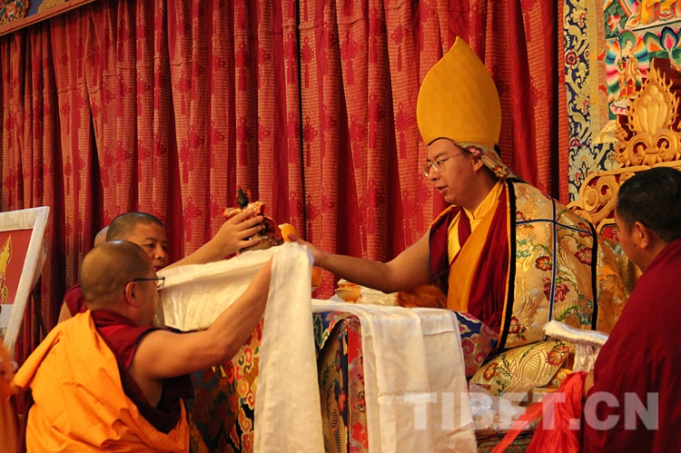 圖為土多申格副院長(zhǎng)帶領(lǐng)經(jīng)師代表和學(xué)員代表,虔誠(chéng)地向十一世班禪敬獻(xiàn)曼扎、佛像、佛塔、佛經(jīng)。攝影:孫健