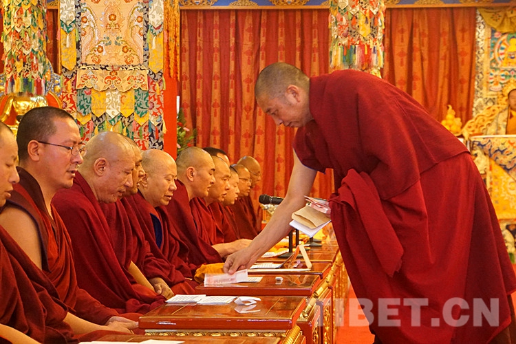 誦經(jīng)結(jié)束后,土多申格副院長(zhǎng)帶領(lǐng)3名經(jīng)師代表和3名學(xué)員代表,虔誠(chéng)地向十一世班禪敬獻(xiàn)曼扎、佛像、佛塔、佛經(jīng),進(jìn)行佛事禮拜。班禪微笑接過(guò)供奉,為他們摸頂賜福。
