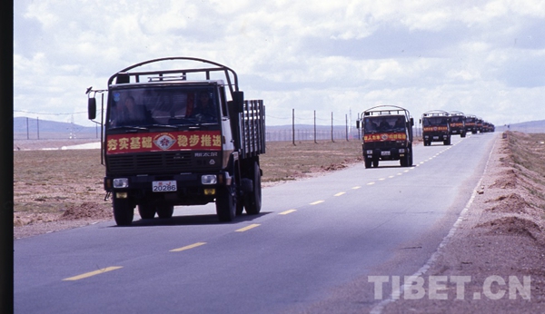 但是,青藏線最重要的使命不在于她為人們提供的觀光功能,而在于它承載了80%的進藏物資的運輸量。在西藏有一句話廣為人知:“青藏公路堵車一日,拉薩物價不穩(wěn)三天”,它可稱得上是西藏人民的“生命線”,青藏公路建成通車50年來,國家相繼投入近30億元進行了三次大規(guī)模整改:1985年實現(xiàn)全線黑色化瀝青柏油路面;1999年消除水毀和凍土等病害隱患;2004年8月,長1160公里的青藏公路格拉段三期改造工程通過驗收,全球海拔最高的高原二級公路誕生,這使青藏公路的運載能力大大提高。每天都有大量運載貨物的大貨車行進在這條道路上,幾十、上百輛大卡車整整齊齊魚貫行駛在青藏公路上,場面蔚為壯觀。不過這讓我們的超車成了問題,要想超過一個車隊,往往要花上一個多小時。