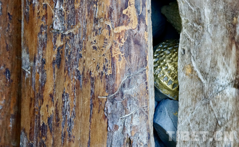上百年的羊皮經(jīng)筒,里面裝著厚厚的一匝匝經(jīng)卷,被若干次轉動后,羊皮裂開了口子,巧手的藏族群眾用皮繩將歲月的裂口密密縫住,經(jīng)筒又可以轉繞好多年。擦康被木板封住了,小蟲在木板上啃蝕出畫作一樣的痕跡,木板縫隙中,閃耀著金色的光芒,光芒來自擦康里放置的擦塔——一個上面有著108座小塔的擦塔。