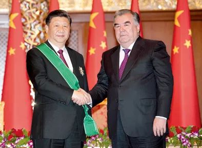 6月14日,習(xí)近平主席抵達(dá)塔吉克斯坦首都杜尚別時,塔總統(tǒng)拉赫蒙也親自前往機(jī)場迎接。期間,習(xí)近平被授予塔吉克斯坦國家最高勛章“王冠勛章”。