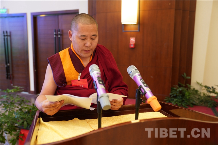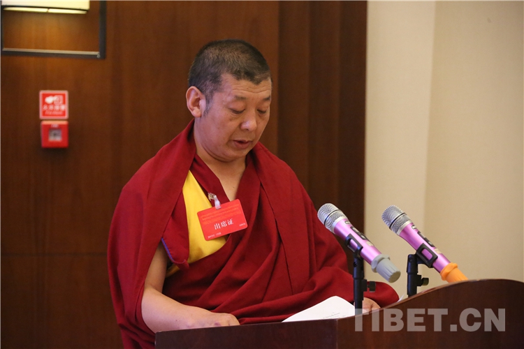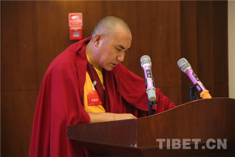 西藏自治區(qū)政協(xié)副主席、中國佛教協(xié)會西藏分會常務(wù)副會長、西藏佛學(xué)院院長珠康?土登克珠以“維護(hù)祖國統(tǒng)一和民族團(tuán)結(jié),堅決反對分裂”為題,作教義闡釋演講。