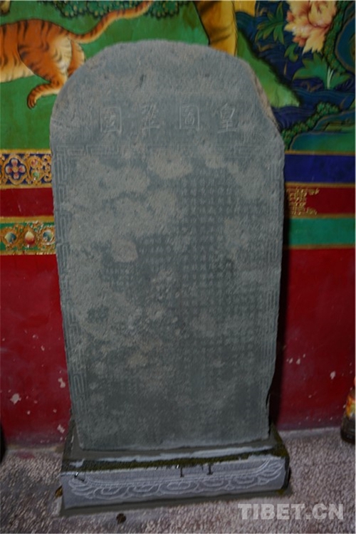 皇圖鞏固碑立于1817年,碑高約120厘米,寬60厘米。四周鐫刻“萬字格”花邊,無碑帽,碑額半圓形,碑身為方形,系青灰色石板鑿制而成,碑面少許被雨蝕脫皮的痕跡,碑文直書,字跡清晰,刻有“皇圖鞏固”四個大字,主要講述日喀則關(guān)帝廟興建始末。碑文主要記載了當(dāng)時從內(nèi)地來藏戍邊的官兵,看到后藏地方風(fēng)雨失調(diào)收成不好,無力幫助當(dāng)?shù)孛癖姼脑熳匀幻馐転?zāi)害,就按照內(nèi)地風(fēng)俗把希望寄托于神靈的保佑,集資興建了紅廟,把內(nèi)地神祇(財神、龍王、土地)搬到后藏供奉,以幫助后藏人民解除旱澇之苦。該碑是研究當(dāng)時駐江孜、定日清軍的重要資料。