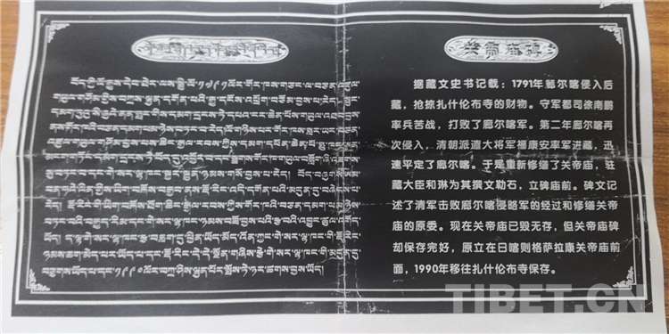 重修關(guān)帝廟碑立于1794年,碑形為長方形,無碑帽、碑座,以青灰色石板鑿制而成,石質(zhì)堅硬,平整光滑,四邊規(guī)整,由于多年風(fēng)雨侵蝕個別字無法識別。碑文由當(dāng)時駐藏大臣和琳(和珅之弟)撰寫,碑文主要講述了關(guān)帝廟重建始末。乾隆五十六年左右,廓爾喀入侵日喀則,洗劫班禪駐錫地,乾隆帝派??蛋猜时安卣饔?,七戰(zhàn)七捷,將廓爾喀人驅(qū)逐出境,并兵逼廓爾喀都城“陽布”(今加德滿都),期間出現(xiàn)掘地得水、天氣突變凍斃廓爾喀士兵等事件,清軍士兵皆認(rèn)為是關(guān)帝顯靈,感關(guān)帝護(hù)佑之恩,于是重建關(guān)帝廟。