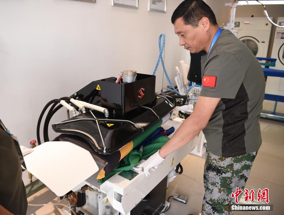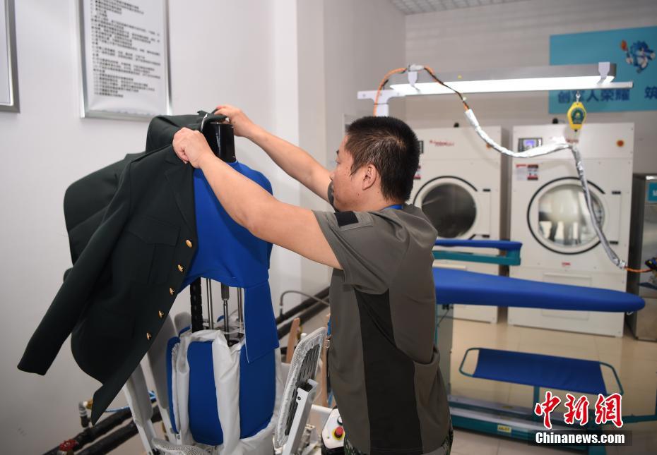 龔寶翠在熨燙軍裝。洗滌服務(wù)保障組工作間面積不大,但干洗機、熨燙機、洗鞋機等各式設(shè)備一應(yīng)俱全。中新社記者 侯宇 攝