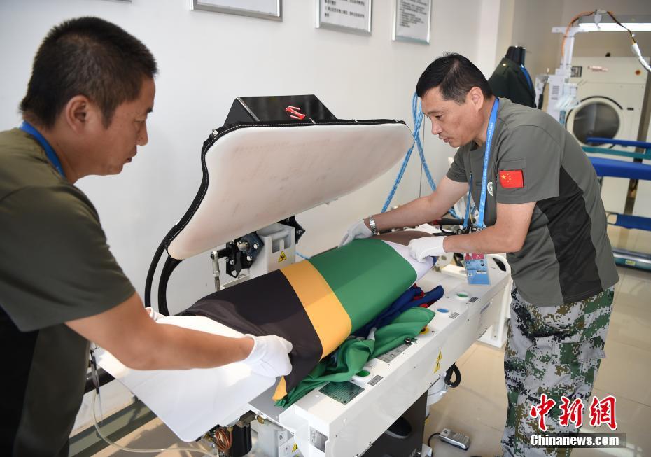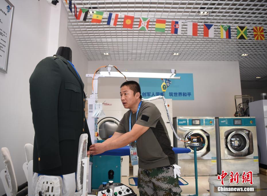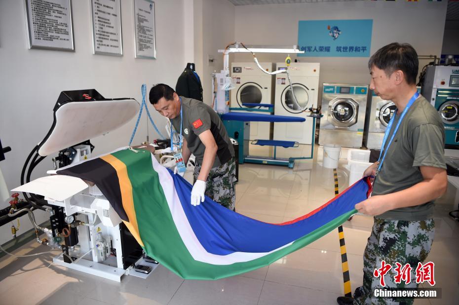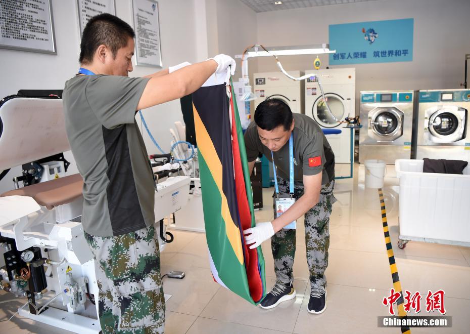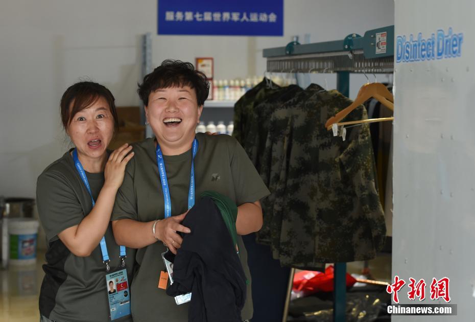 位于湖北省武漢市的第七屆世界軍人運動會運動員村(軍運村)里,有一群提供洗滌熨燙服務(wù)的軍哥軍嫂:他們都是退伍軍人或軍屬。洗滌服務(wù)保障組副組長王繼東介紹,保障組由25人組成,每個班次有9人,每天8點半至22點半,為入住軍運村的運動員、代表團官員提供衣物清潔、修補等保障工作。除此之外,他們還負責熨燙軍運會會旗、國際軍事體育理事會會旗、各成員國國旗等300余面旗幟。由他們親手熨燙好的旗幟會被送至軍運會禮賓部,供各項目比賽結(jié)束后的頒獎及升旗儀式等使用。圖為參加武漢軍運會的巴西代表團官員來到洗滌服務(wù)保障組送洗衣物,接待他們的軍嫂熱情認真地提供服務(wù)。中新社記者 侯宇 攝