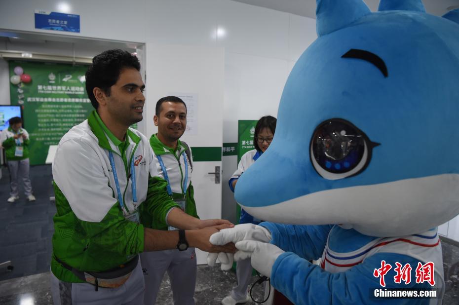10月24日,幾位在第七屆世界軍人運(yùn)動會舉辦期間迎來生日的志愿者“小水杉”在主媒體中心內(nèi)的“志愿者之家”過集體生日。圖為來自埃及的志愿者艾爾侯賽因與軍運(yùn)會吉祥物“兵兵”交流。中新社記者 侯宇 攝