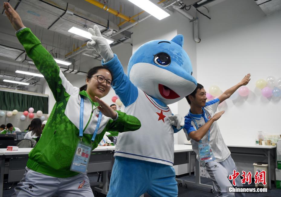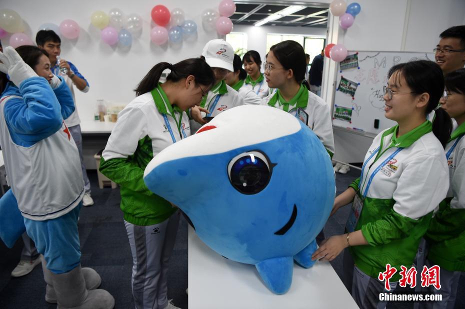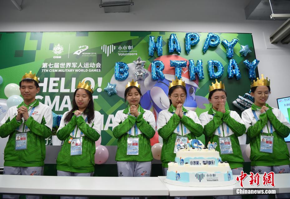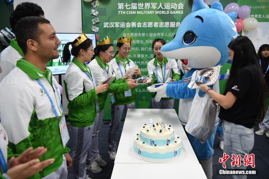 10月24日,幾位在第七屆世界軍人運(yùn)動會舉辦期間迎來生日的志愿者“小水杉”在主媒體中心內(nèi)的“志愿者之家”過集體生日。圖為軍運(yùn)會吉祥物“兵兵”向過生日的志愿者們送上小禮物。中新社記者 侯宇 攝