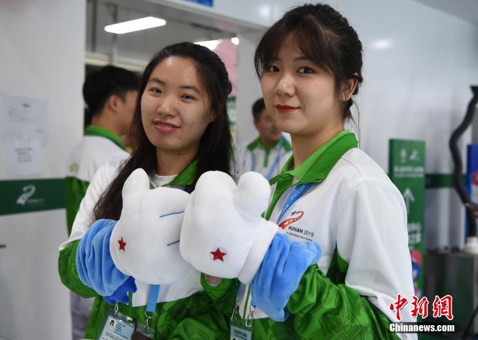 10月24日,幾位在第七屆世界軍人運(yùn)動會舉辦期間迎來生日的志愿者“小水杉”在主媒體中心內(nèi)的“志愿者之家”過集體生日。圖為兩名志愿者帶著軍運(yùn)會吉祥物“兵兵”的手套合影。中新社記者 侯宇 攝