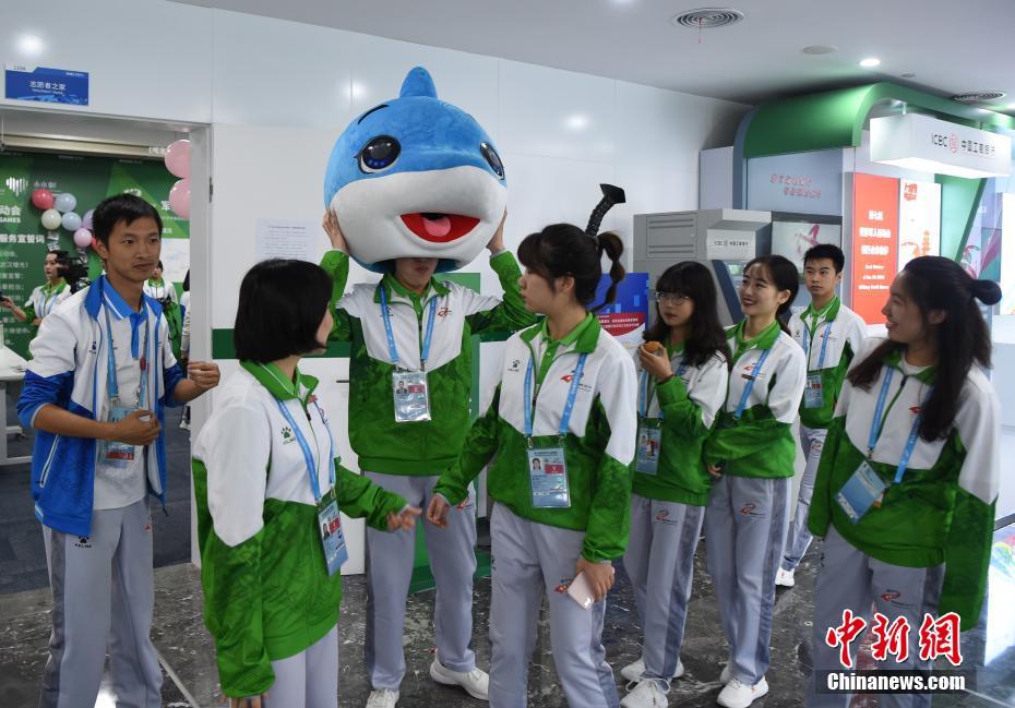 10月24日,幾位在第七屆世界軍人運(yùn)動會舉辦期間迎來生日的志愿者“小水杉”在主媒體中心內(nèi)的“志愿者之家”過集體生日。圖為志愿者們好奇地探視軍運(yùn)會吉祥物“兵兵”的頭套內(nèi)部。中新社記者 侯宇 攝