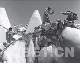珍惜來之不易的工作機會,恨不得把兩年損失一下子補回來,這一天謝自楚忘我投入,在冰裂隙區(qū)跳來跳去,在冰磧丘中攀上爬下;只身前往東絨布冰川,補拍粒雪盆照片,這是測繪組同事委托的額外任務。返回營地已在午夜,這一天總計在海拔6000米上下行走20個小時,負重20多公斤,行程約30公里。這一天他觀察到珠峰獨特的滲浸凍結成冰作用,對于冰川學來說,當屬探索珠峰冰川成冰之謎的重要發(fā)現。