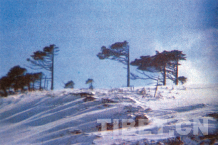 旗形樹是多雄拉山口的標(biāo)志性景觀。迎風(fēng)一面樹干光裸,是因每當(dāng)新枝嫩芽生發(fā),不待長大,必被風(fēng)雪摧折,致使枝葉只在背風(fēng)一側(cè)生長。