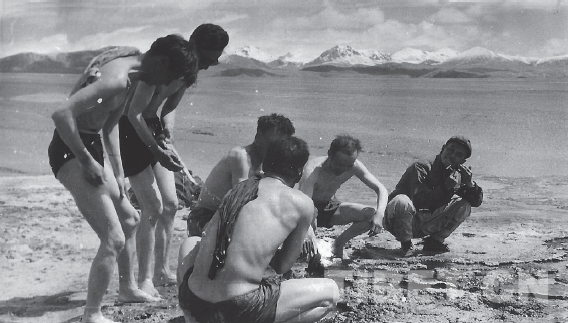 阿里分隊1976年8月在日土縣帕也布也雪山下的帕也曲真溫泉邊洗澡。站立者左為黃復(fù)生,右為孫鴻烈;蹲坐者右起:章銘陶、謝自楚、武素功等 王富葆/攝影