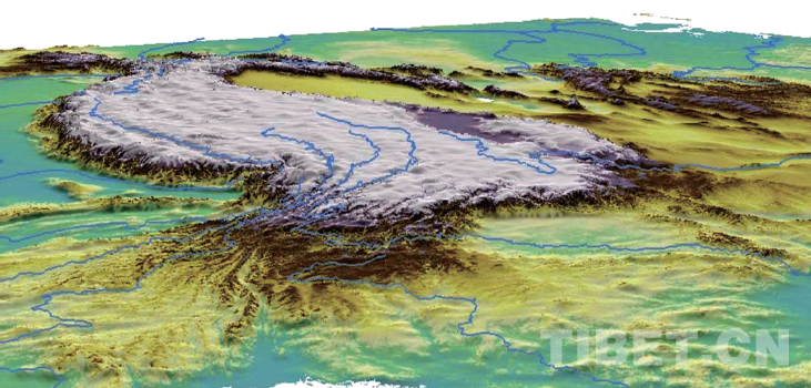 青藏高原衛(wèi)星圖片上,藍(lán)色的水系是根據(jù)原始數(shù)據(jù)繪制的。自右至左為:黃河,金沙江—長江,瀾滄江—湄公河,怒江—薩爾溫江,雅魯藏布江—布拉馬普特拉河,獨龍江—伊洛瓦底江。左上角阿里境內(nèi)的獅泉河、象泉河、孔雀河等外流河,分別成為印度河、恒河的源頭或上源支流 楊經(jīng)綏/供圖