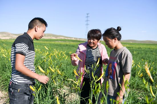 吳忠市太陽山清泉林業(yè)專業(yè)合作社負(fù)責(zé)人李志巧正在教兩名勤工儉學(xué)的孩子如何采摘黃花菜。