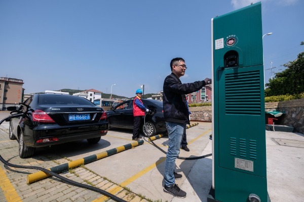 5月10日,游客在嵊泗縣菜園鎮(zhèn)高場(chǎng)灣村停車場(chǎng)刷卡給電動(dòng)汽車充電。新華社記者 徐昱 攝