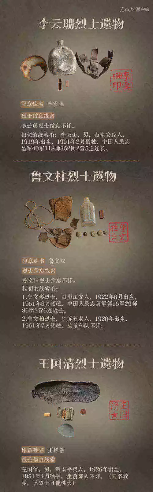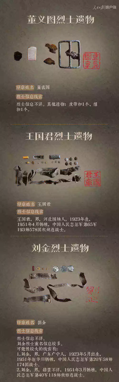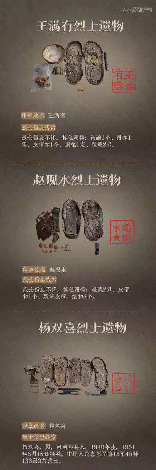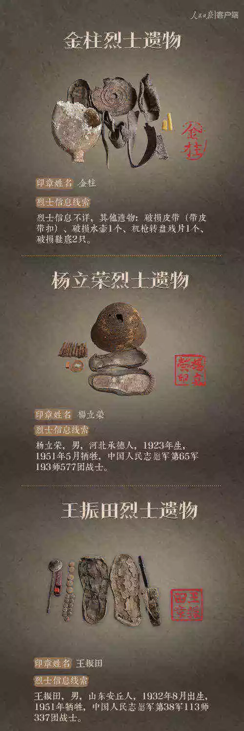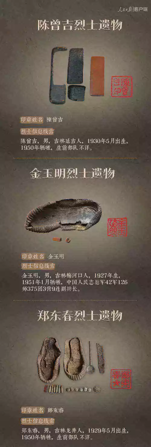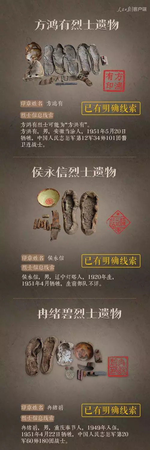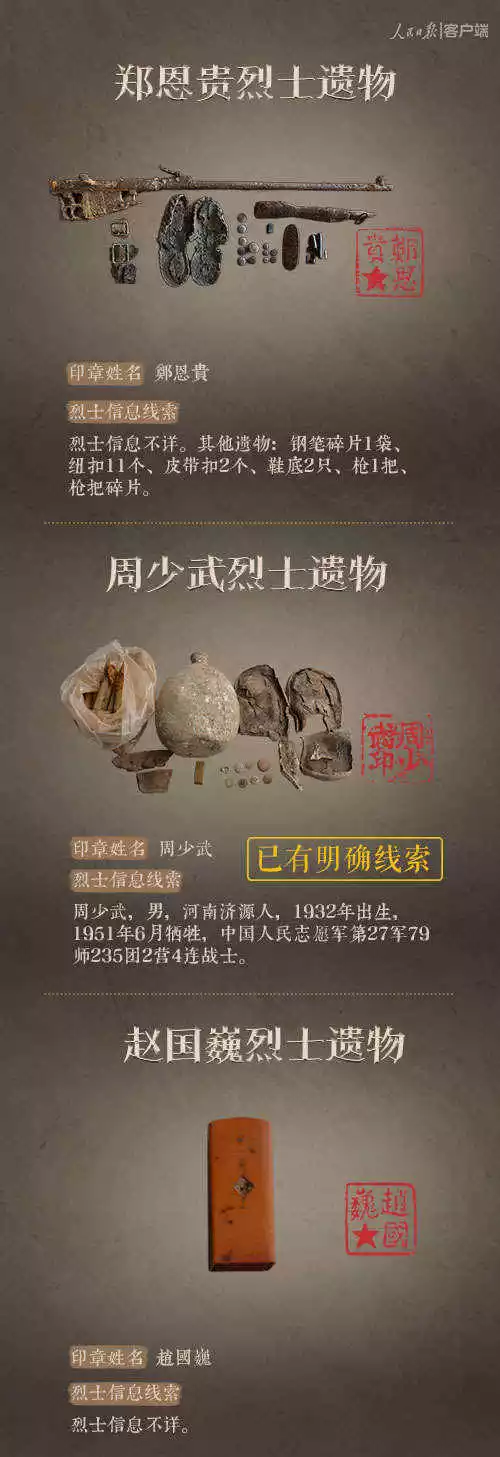 2014年以來(lái),先后有五批589位在韓志愿軍烈士遺骸回到祖國(guó)懷抱。退役軍人事務(wù)部從這些烈士的上千件遺物中,發(fā)現(xiàn)了姓名文字圖案清晰可見的24枚印章。近日與人民日?qǐng)?bào)新媒體等共同發(fā)起#尋找英雄#媒體行動(dòng),向全社會(huì)征集這24位烈士親屬線索。3月29日,人民日?qǐng)?bào)客戶端、法人微博、微信公號(hào)同時(shí)發(fā)布稿件《當(dāng)年,他們?yōu)槲覀儬奚?;今天,?qǐng)為他們做一件事》,向社會(huì)介紹“尋找英雄”活動(dòng),并公布24位烈士的基本情況和遺物信息。