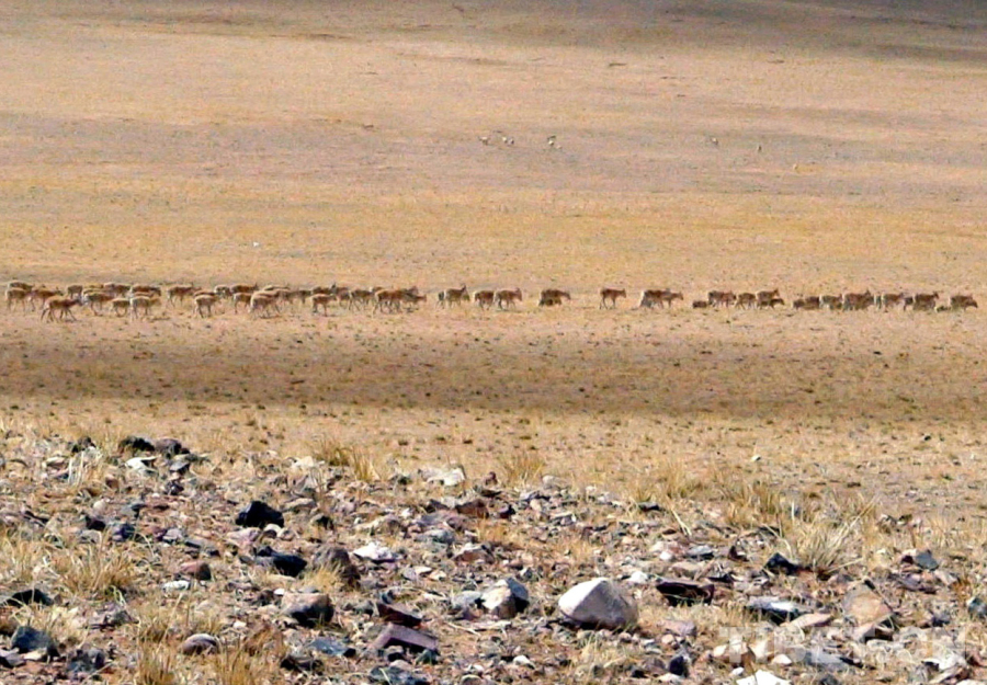 圖為羌塘國(guó)家級(jí)自然保護(hù)區(qū)正在遷徙產(chǎn)羔的成群藏羚羊(唐召明2006年攝)