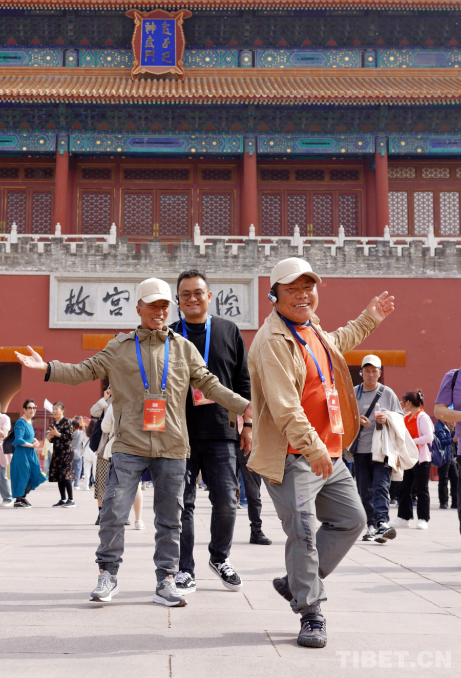 圖為羌塘國(guó)家級(jí)自然保護(hù)區(qū)尼瑪縣羅布玉杰管理站野保員扎西索朗(右一)在北京故宮博物院參觀時(shí),情不自禁地跳起鍋莊舞(王麒龍2024年4月25日攝)