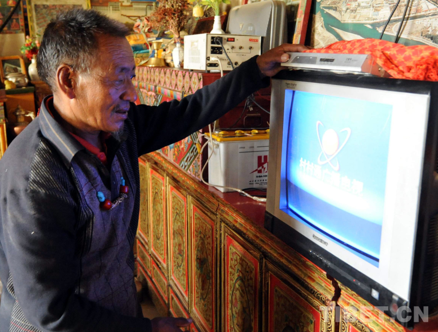 這是尼瑪縣文部鄉(xiāng)南村農(nóng)民次成旦增在家里使用光伏發(fā)電設備,收看“村村通”廣播電視(唐召明2009年攝)