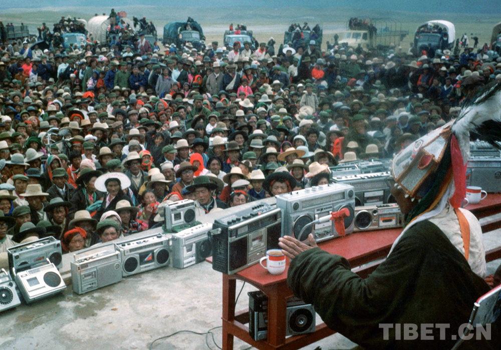 圖為說唱藝人阿達在那曲賽馬會上說唱《格薩爾》的傳奇故事,臺上擺滿了牧民群眾的各式錄音機(唐召明提供,才龍1987年前后攝)