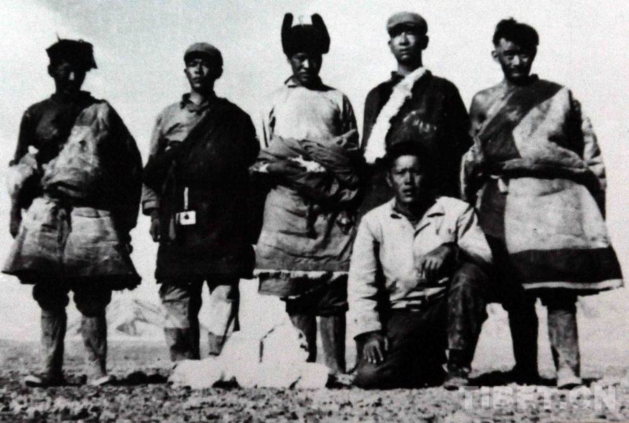 這是開發(fā)藏北無人區(qū)拓荒者洛桑丹珍(前排蹲者)與其所率領(lǐng)的勘察小組成員,在無人區(qū)合影留念(唐召明提供,1973年夏攝)