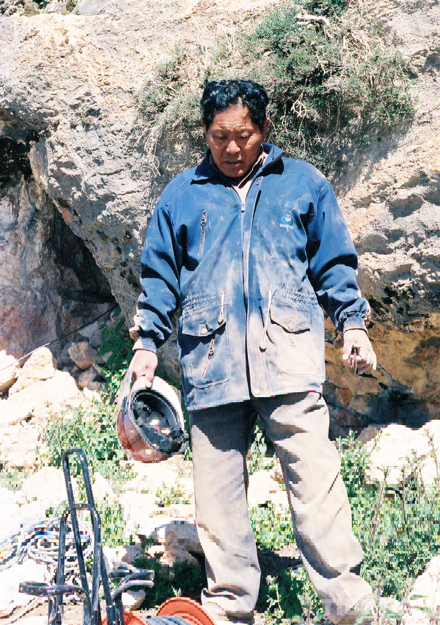 這是率隊在藏北無人區(qū)科考中,時任西藏人大常委會副主任洛桑丹珍搶著去身后狹小的洞里去探洞。當(dāng)爬出洞時,全身沾滿了泥土(唐召明2001年7月6日攝)