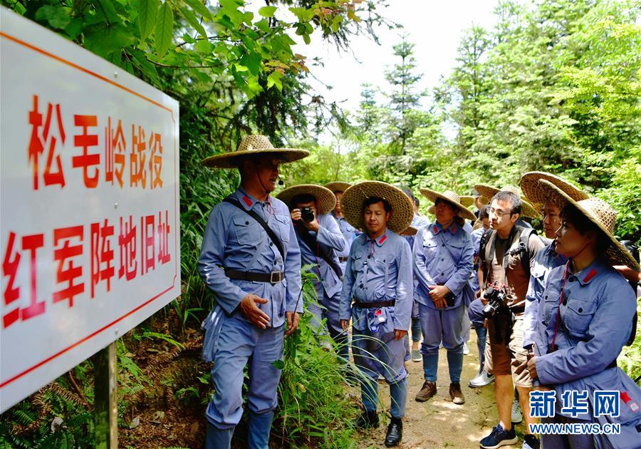 6月17日,記者們在松毛嶺戰(zhàn)役紅軍陣地舊址進行體驗式采訪。 新華社記者魏培全攝