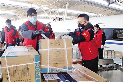 在突擊隊(duì)為生命接力的日子里,曾有兩名醫(yī)療隊(duì)隊(duì)員不小心將自己的隨身背包落在了車上。列車已經(jīng)開走了,突擊隊(duì)隊(duì)員聞?dòng)嶑R上聯(lián)系列車長,待東西找到后,再通過第二天的過路火車帶回武漢,并轉(zhuǎn)送到醫(yī)療人員的手里。賈青青說:“我們的目標(biāo)是一致的,那就是為武漢加速。他們?yōu)榛颊叻?wù),我們就為他們服務(wù)?!?/p>
