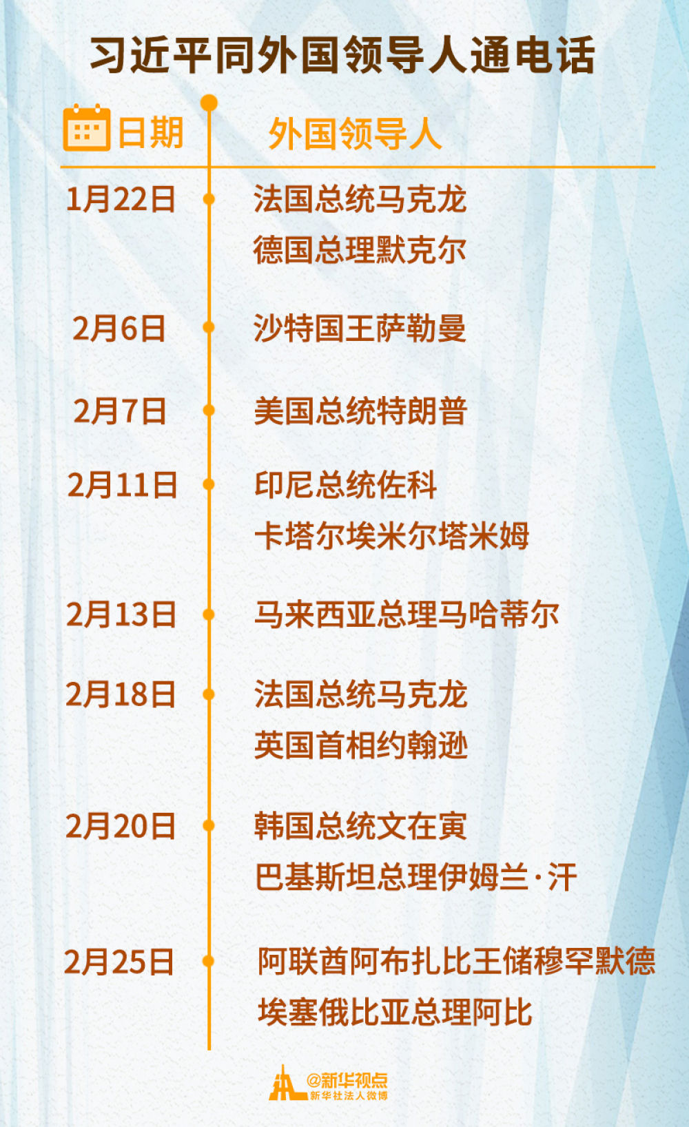 2月以來,習(xí)近平主席已先后同11位外國領(lǐng)導(dǎo)人通電話,涉及國家遍及亞洲、歐洲、非洲、美洲等地區(qū)。