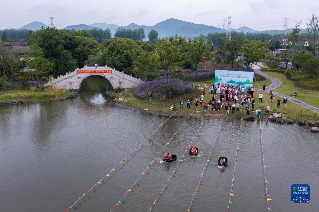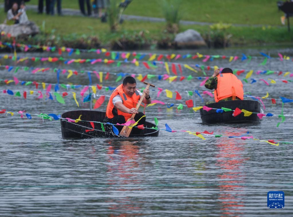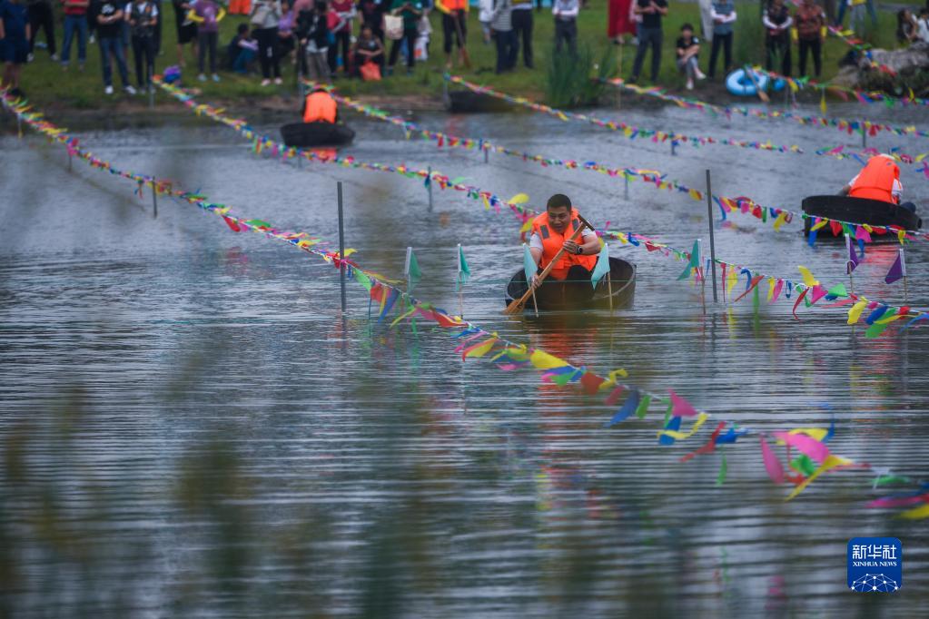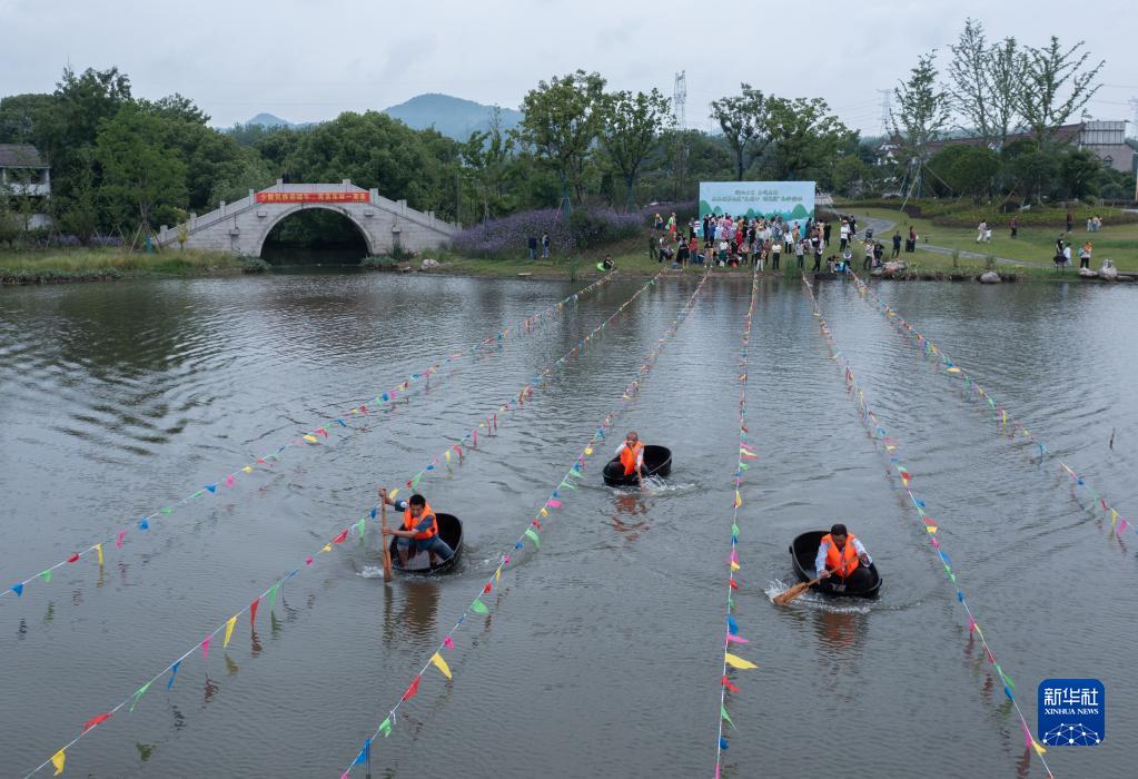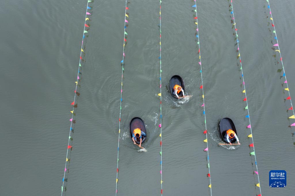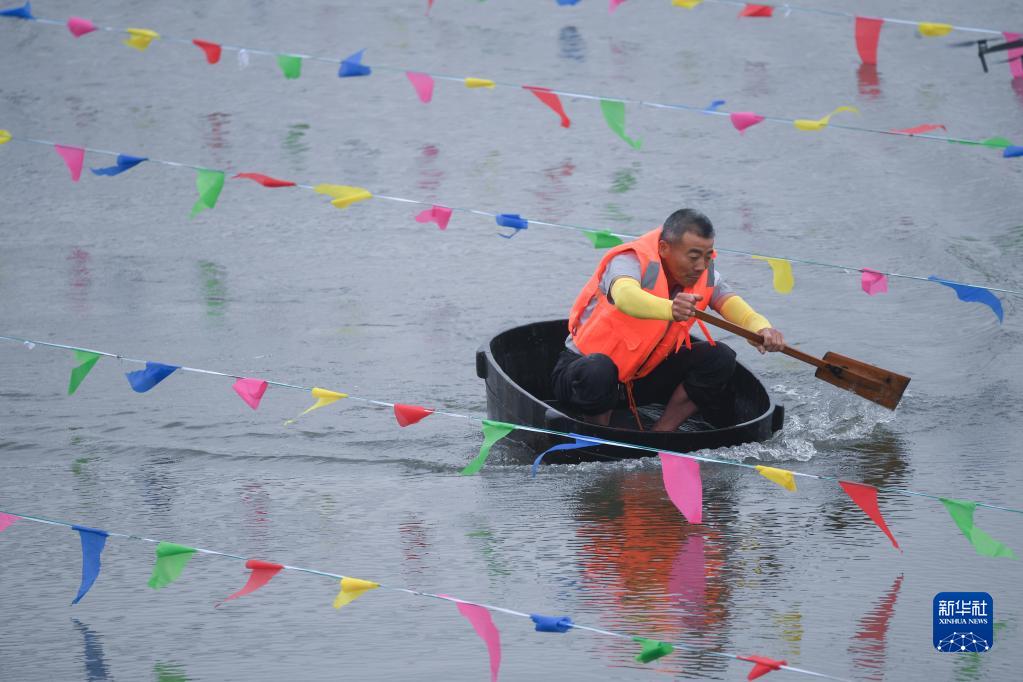 5月28日,在東林鎮(zhèn)保國村倪家灣港,村民參加“慶端午 劃菱桶”趣味比賽。新華社記者 徐昱 攝