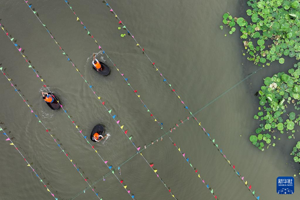 5月28日,在浙江省湖州市吳興區(qū),當(dāng)?shù)卮迕裨诤商羶?nèi)參加端午劃菱桶趣味活動(dòng)(無(wú)人機(jī)照片)。新華社發(fā)(伊凡 攝)