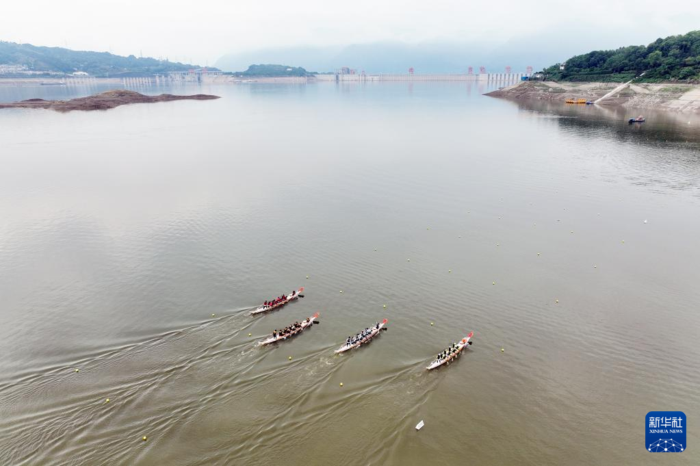 5月28日,在湖北省宜昌市秭歸縣,龍舟選手在三峽大壩附近水域進(jìn)行龍舟比賽(無(wú)人機(jī)照片)。新華社發(fā)(王輝富 攝)