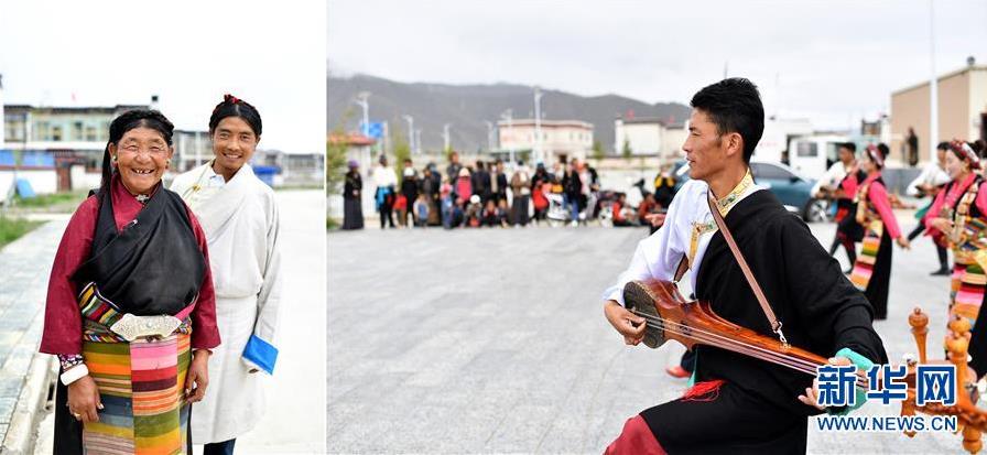 拼版照片:左圖為西藏日喀則市拉孜縣查務(wù)鄉(xiāng)明瑪村村民倉瓊(左)和兒子群培次仁;右圖為拉孜縣民間藝術(shù)團(tuán)在明瑪村易地搬遷點(diǎn)為村民表演。明瑪村舊村交通不便,資源匱乏,自然環(huán)境惡劣,發(fā)展和脫貧受到制約。2016年,當(dāng)?shù)卣?jīng)多次規(guī)劃研究,在征求村民意見后,確定將明瑪村整村搬遷。2016年10月,倉瓊和家人搬遷到了明瑪村新村。新村交通便利,文化休閑廣場、活動室、學(xué)校等基礎(chǔ)設(shè)施完善。倉瓊和家人商量后,在新村開了一家小商店,一年有1萬多元的收入,再加上村里養(yǎng)殖專業(yè)合作社的分紅,倉瓊一家的日子越來越好(8月2日攝)。 新華社記者 詹彥 攝