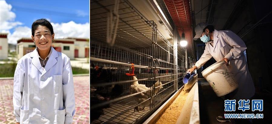拼版照片:左圖為西藏日喀則市拉孜縣曲下鎮(zhèn)吉如村村民卓嘎;右圖為卓嘎在拉孜縣拉貴藏雞養(yǎng)殖孵化保種基地里忙碌。2020年年初,卓嘎來到拉貴藏雞養(yǎng)殖孵化保種基地工作,很快就學(xué)會了藏雞的養(yǎng)殖技術(shù),在這里工作,卓嘎每個月能拿到4000多元的工資(8月1日攝)。 新華社記者 詹彥 攝
