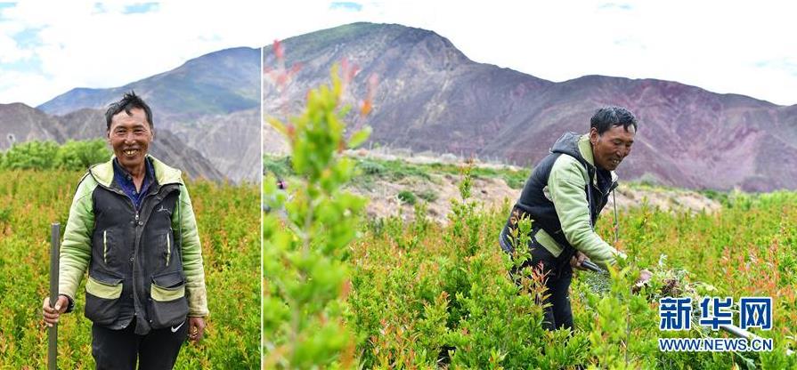 拼版照片:左圖為西藏昌都市芒康縣納西民族鄉(xiāng)加達(dá)村村民土登曲培;右圖為土登曲培在芒康縣納西民族鄉(xiāng)三江農(nóng)民專業(yè)合作社的苗圃里忙碌。幾年前,土登曲培來到三江農(nóng)民專業(yè)合作社打工,負(fù)責(zé)種樹和喂牛,每月有3000多元的收入(5月4日攝)。 新華社記者 詹彥 攝