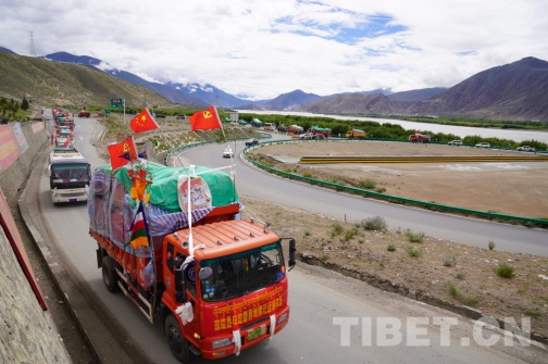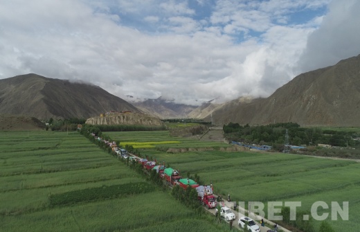7月10日9時30分,國家重點文物保護單位——松贊干布陵區(qū)前,懸掛著“瓊結鎮(zhèn)易地搬遷運輸車隊”的39輛車整齊列隊, 20戶78名搬遷戶身著節(jié)日的盛裝,坐著滿載著搬遷群眾幸福和希望的運輸車隊浩浩蕩蕩地從瓊結縣出發(fā),前往山南市乃東區(qū)多頗章鄉(xiāng)嘎東團結新村搬遷點。
